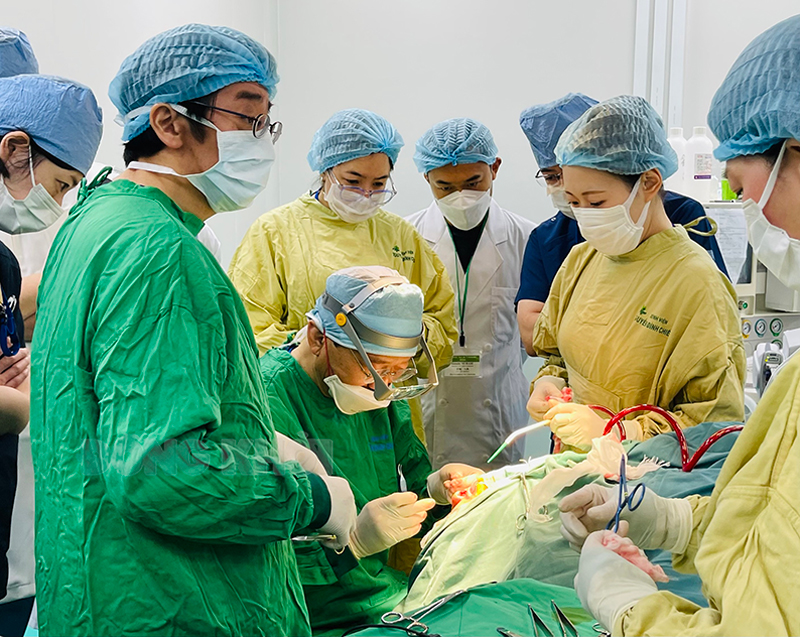 GS.TS. Y khoa Nagato Natsume (người ngồi) và con gái (bìa phải) trong ca phẫu thuật cho trẻ hở môi tại Bệnh viện Nguyễn Đình Chiểu.