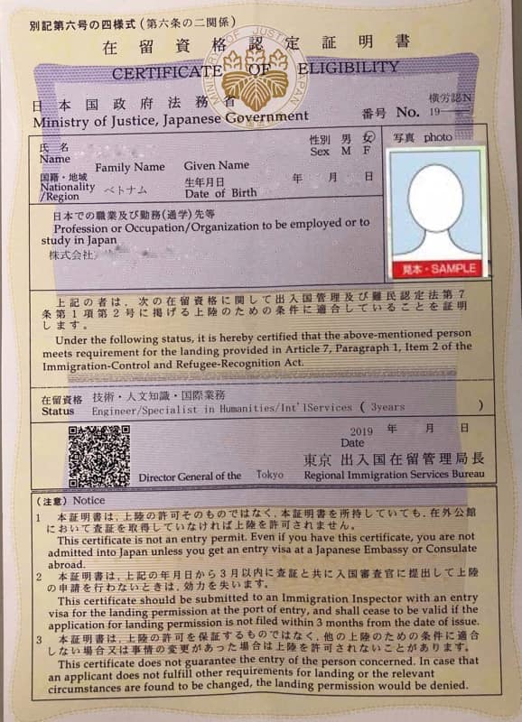 Sau khi được thẩm định vô sự, CQLNC Nhật Bản sẽ phát hành Giấy chứng nhận tư cách lưu trú (CEO)và gửi cho công ty thuê mướn người nước ngoài đó. Công ty sẽ gửi CEO cho đương sự ở nước ngoài, đến cơ quan Lãnh sự của Nhật ở nước đó để làm thủ tục nhận visa nhập cảnh vào Nhật Bản.